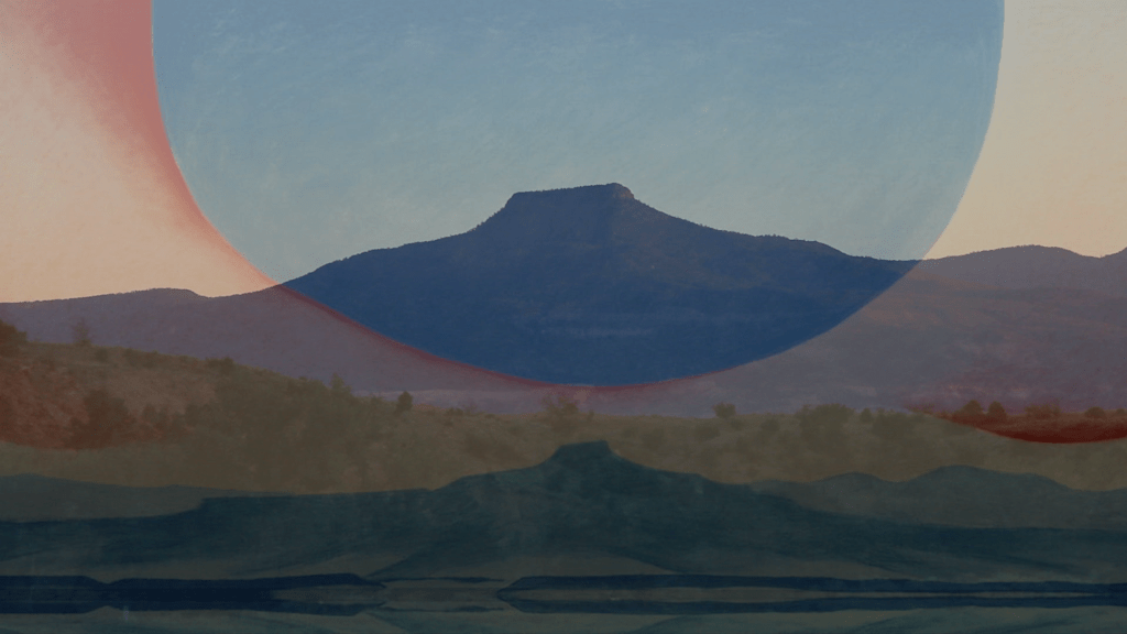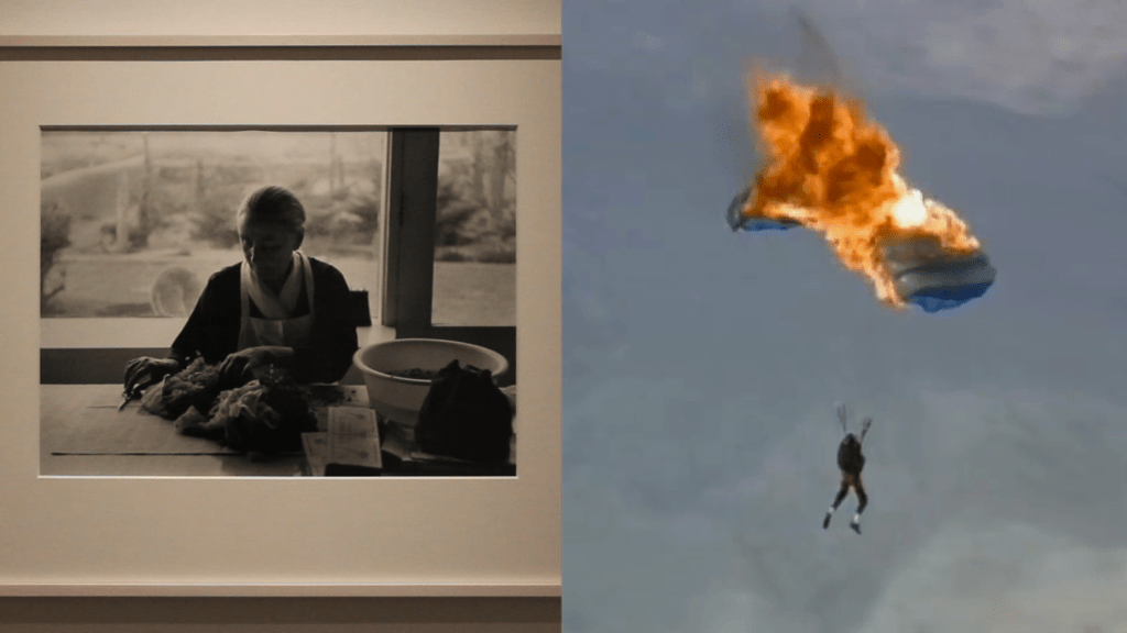 The framed pictures of O’Keeffe were filmed at the Georgia O’Keeffe Museum in Santa Fe, but the archival footage is collected from TV specials and documentaries that ended up on YouTube. I really can’t remember how that parachute-on-fire footage turned up. So I guess I was observing my own time-wasting and wondering if that wasn’t relevant to the way we get stuck in our desire for role models. I never really had any.